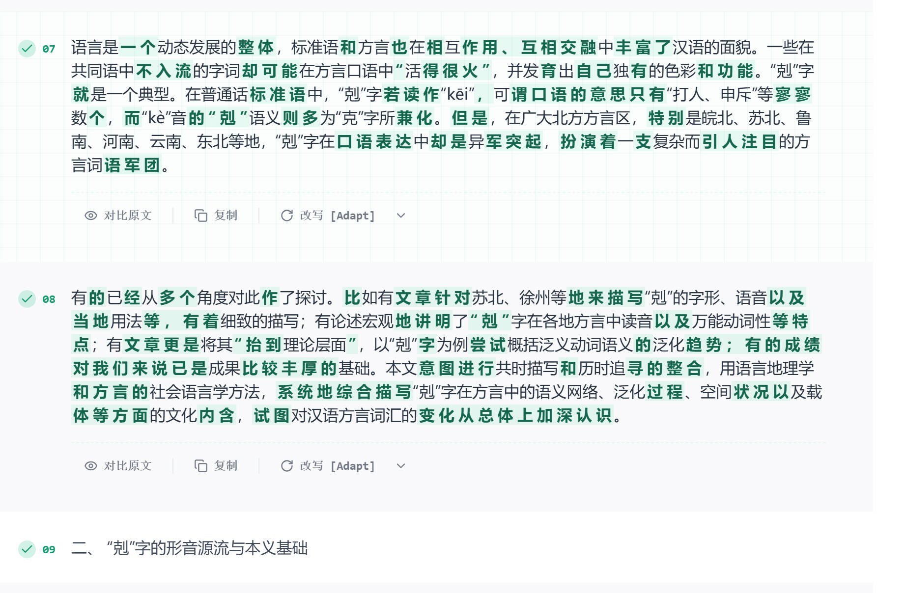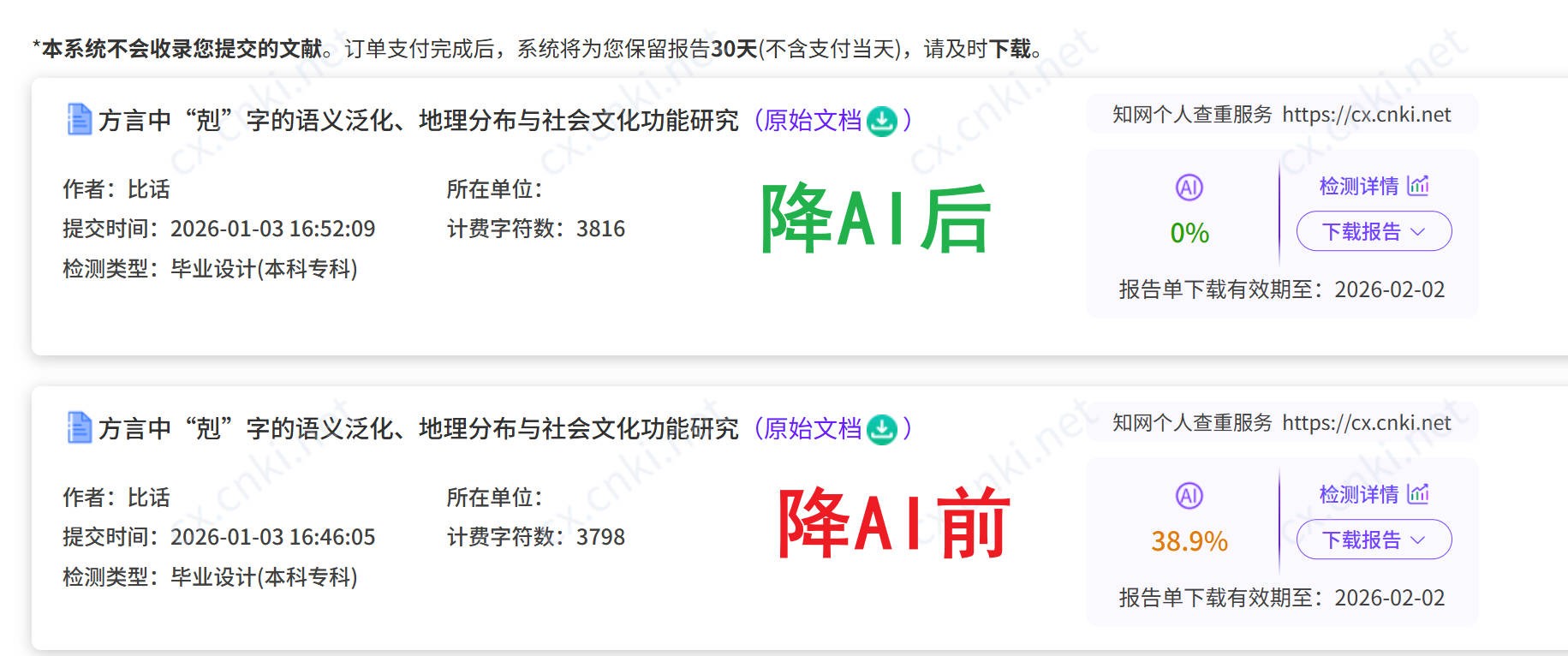 知网检测的是哪些维度,先本人一遍,沉点看三个方面: 言语读起来通欠亨畅、学术味能否保留;各类型论文都有堆集。实测数据中!怎样从90%降到平安线以下?这篇给你一套从AI率飘红达到标的完整操做流程,按步调做,间接问员或查学院结业论文办理法子——不要猜。2-3分钟处置+10分钟查抄,比话就正在哪些维度上做处置——这就是知网专攻的寄义。许诺知网AI率降至15%以下。这些段落由于消息稠密、布局工整,60%看起来很高,先测一段看结果。15%以上全额退款这个许诺就是正在自投罗网!用免费额度测一段最AI的内容,几乎每句都正在20-30字。AI率60%、学校要求20% → 你需要降40个百分点以上。处置逻辑完全分歧。7天内不合错误劲可从头处置统一订单;而正在于降AI东西的处置深度够不敷。